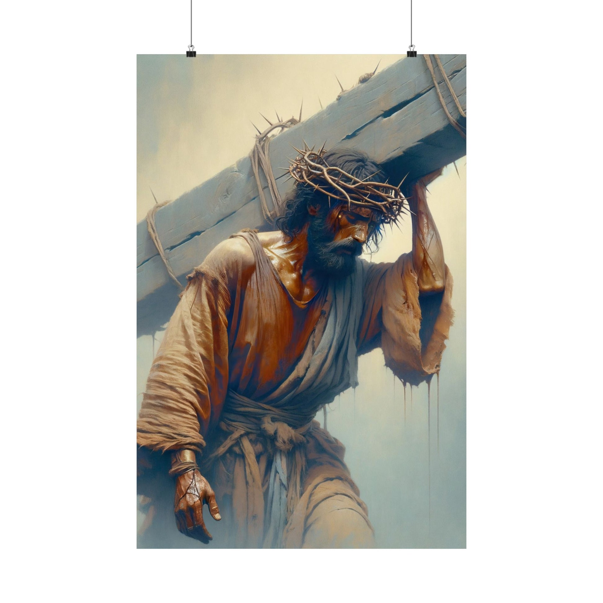 Honor the true meaning of Easter with this stunning, faith-inspiring poster, capturing the powerful moment of Jesus suffering, bleeding, and carrying the cross. As He bore the weight of the world’s sin, His unwavering love and sacrifice remind us of the price He paid for our redemption.